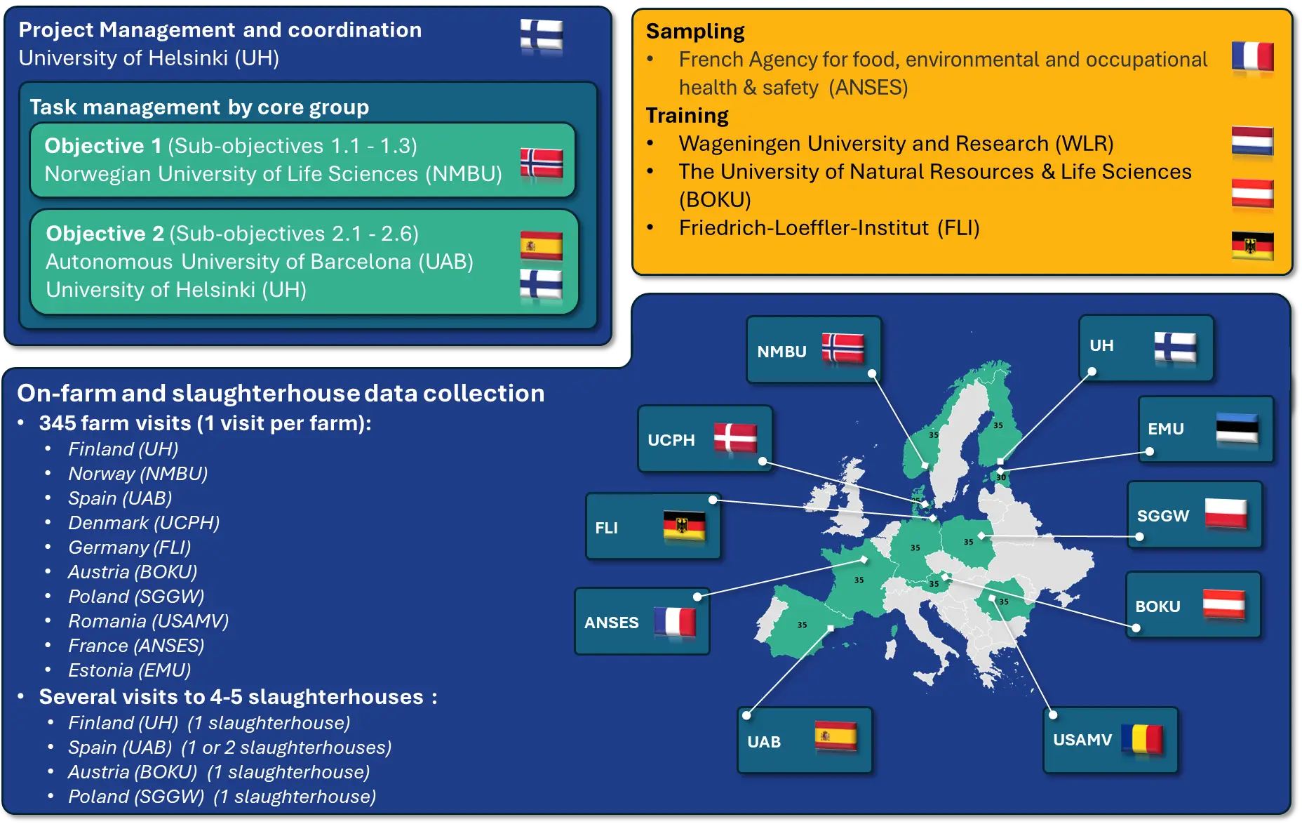 University of Helsinki (UH) coordinates and manages the consortium, as well as leading the tasks which specifically require coordination between partners. UH is supported by epidemiological expertise from the French Agency for Food, Environmental and Occupational Health & Safety (ANSES).